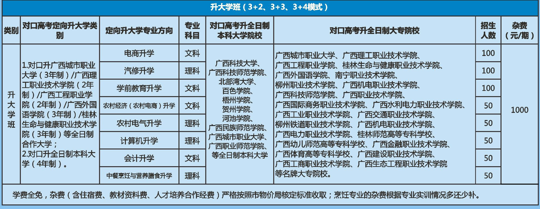 升大学班的同学三年学费全免,只收取杂费。还与中职班的学生同等享受国家对中职学校的多项助学补贴政策,包括国家助学金(一档6000元/2年,二档2000元/2年)、国家“雨露计划”扶贫补助(9000元/3年)国家奖学金6000元、自治区奖学金2000元、企业资助等优惠,涉农方向的升大学班学生100%享受国家助学金(2000元/2年)。